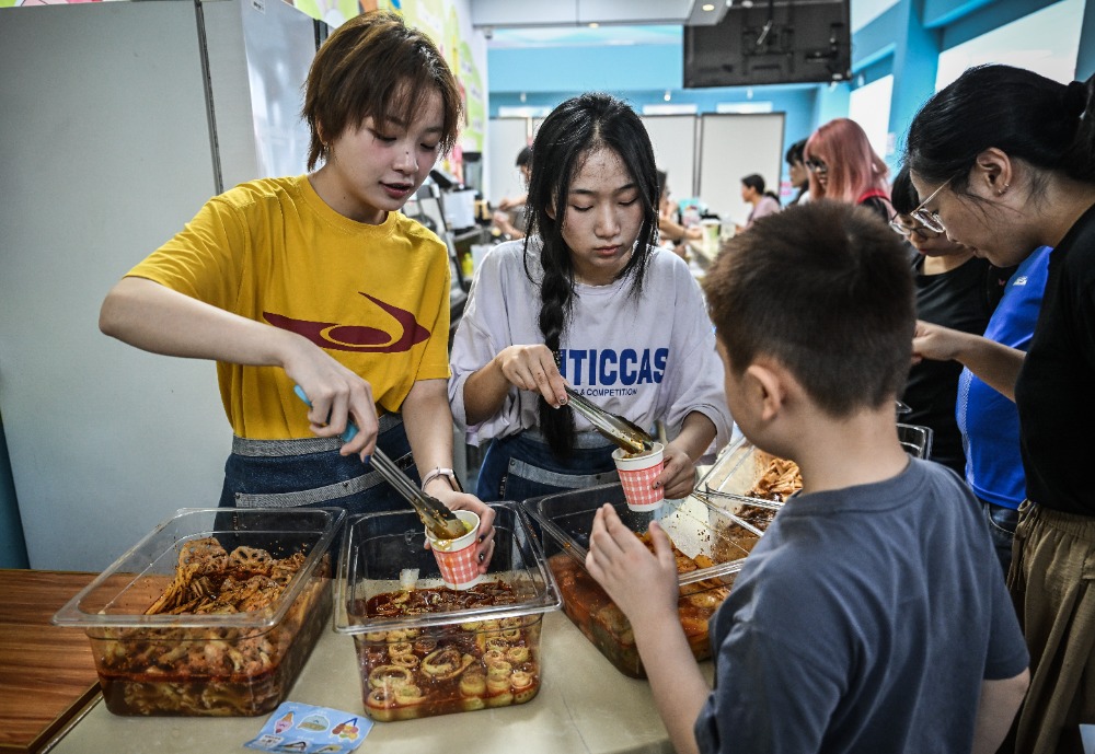 ▲5月29日,重慶師范大學(xué)兒童智能發(fā)展研究中心,大學(xué)生們?yōu)楹⒆訙?zhǔn)備了各種美食。記者 劉力 攝