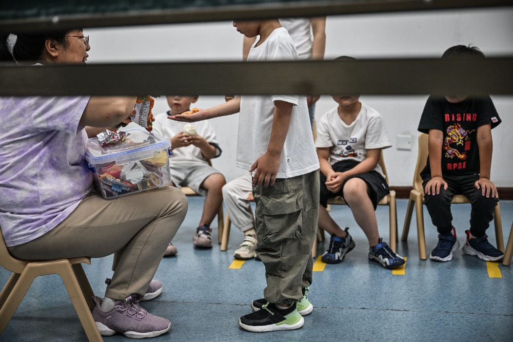 ▲5月29日,重慶師范大學(xué)兒童智能發(fā)展研究中心,大學(xué)生用手持小風(fēng)扇給孩子降溫。記者 劉力 攝