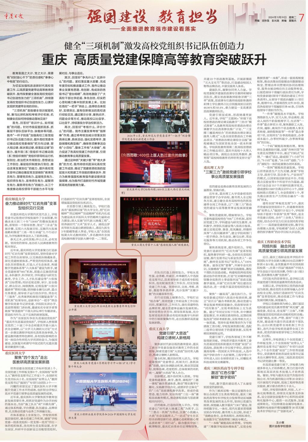 近年來,重慶師范大學黨委聚力打造新時代“紅巖先鋒”變革型組織,堅持黨委對學校工作的全面領導,以完善政治鑄魂體系、深化黨建統領體系、嚴密黨的組織體系、健全隊伍培塑體系、打造人才生態體系、構建數字黨建體系等“六大體系”建設為抓手,健全黨建統領“665”機制,即重點實施黨的建設、本科教學、科學研究、學科建設與研究生教育、學生工作、人才隊伍建設等“六張報表”目標管理;用好巡視巡察、審計、安全穩定、群眾信訪、網絡輿情、紀檢監督“六張問題清單”管控問題;堅持健全賽馬比拼、重點任務推進、領導班子運行綜合評估、常態化“三服務”、優秀案例和典型問題復盤等“五項機制”結果導向,創新舉辦“一把手”例會暨學院黨委書記講黨建、學院院長講辦學、黨政管理部門講治理,邀請知名專家學者等做客“智薈重師”干部大講壇舉行專題講座,營造擔當作為、實干實效的濃厚氛圍。