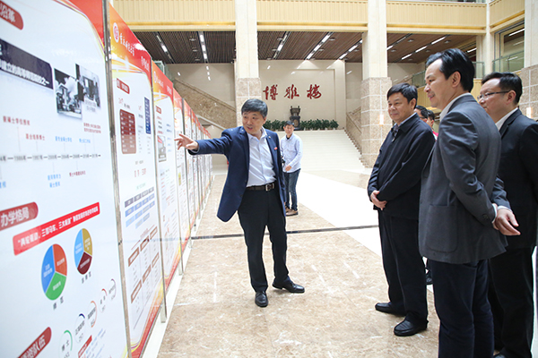 杜占元一行還考察了我校開展愛校教育、集中展現校園文化的校史館,觀看了專題片《黨和國家領導人關心關懷重慶師范大學紀略》。周澤揚校長介紹了學校的辦學歷史、辦學特色、核心理念。60多年的辦學歷程中留下的一幅幅圖片、一件件實物,承載了學校深厚的文化底蘊。杜占元一行不時駐足觀看,詳細了解學校的辦學情況。