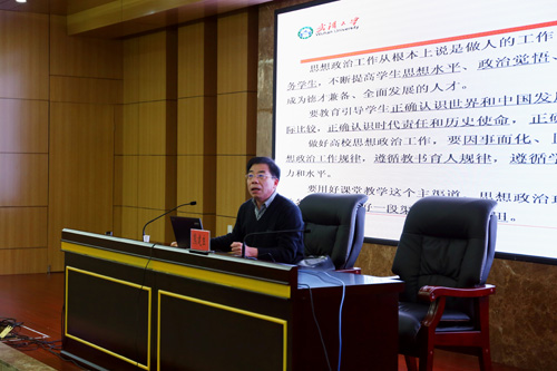 熊建生教授以習(xí)近平總書記在全國高校思想政治工作會議上的講話作為專題報告的導(dǎo)語,圍繞大學(xué)生思想政治教育的價值意蘊(yùn)、時代特色、創(chuàng)新發(fā)展等三個方面,以大學(xué)生思想政治教育的十大核心概念為切入點,分析了大學(xué)生思想政治教育的本質(zhì)屬性;結(jié)合當(dāng)代中國社會的變革、當(dāng)代大學(xué)生的新特點及武漢大學(xué)學(xué)生工作的創(chuàng)新實踐介紹了大學(xué)生思想政治教育的時代特色;最后從找準(zhǔn)定位、突出地位、確保到位、提升品位四個角度深入闡述了大學(xué)生思想政治教育的創(chuàng)新發(fā)展。