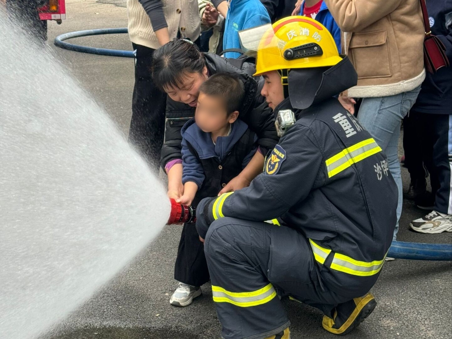 在消防技能展示環(huán)節(jié)中,消防員們快速疊出“豆腐塊”被褥,進(jìn)行井下救援演練和模擬火災(zāi)實(shí)戰(zhàn),利用煙霧機(jī)制造火場(chǎng)環(huán)境,演示快速破拆、傷員轉(zhuǎn)移等流程。孩子們?cè)谥笇?dǎo)下手持消防水槍撲滅“火源”,在實(shí)際操作中強(qiáng)化了滅火技能。