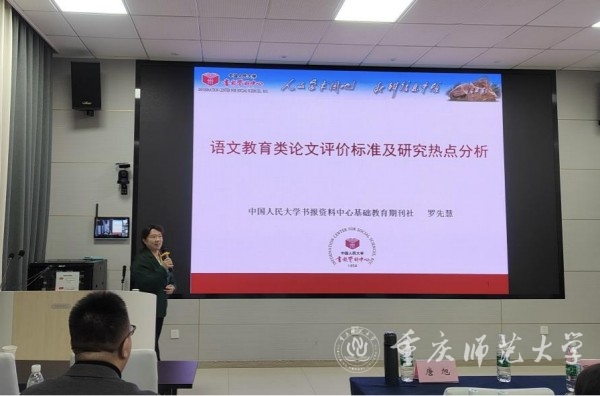 12月3日上午,我校文學院邀請中國人民大學書報資料中心基礎教育期刊社語文學科室主任、副編審羅先慧為“精是講堂”第48期開講,講座題為“語文教育類論文評價標準及研究熱點分析”。文學院唐旭副教授主持講座。文學院、重師附小部分教師及學生代表參加講座。