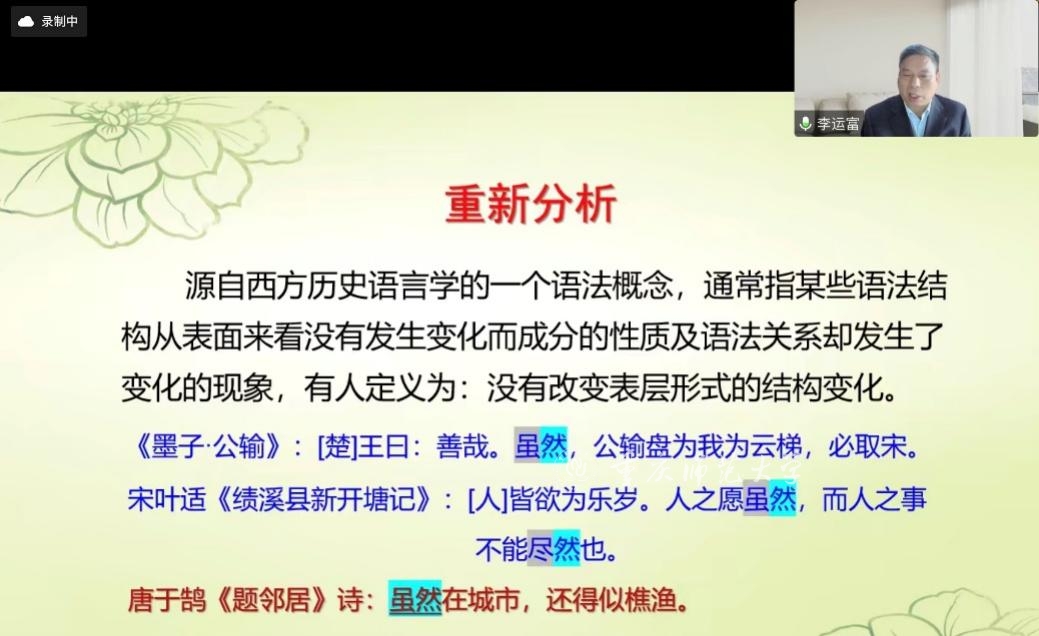4月27日上午,文學(xué)院“精是講堂”邀請鄭州大學(xué)李運富教授于線上作題為“談漢語復(fù)合詞語的‘重新分析’現(xiàn)象”的學(xué)術(shù)講座。講座由文學(xué)院雷冬平教授主持,文學(xué)院2021級、2022級漢語言文字學(xué)專業(yè)研究生和2022級學(xué)科語文專業(yè)研究生悉數(shù)參與。