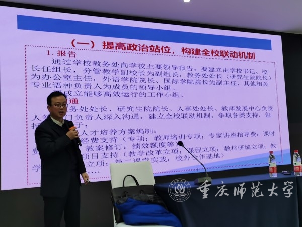 3月2日下午,四川外國語大學副校長祝朝偉應邀擔任我校外國語學院新文科背景下外語專業師資培訓系列講座的第一期嘉賓,于集賢樓412室帶來題為“目的、路徑與建議:關于外語專業思政教育工作的思考”的講座。講座由外國語學院副院長彭康洲和楊潔共同主持,100余名教師聆聽了本次講座。