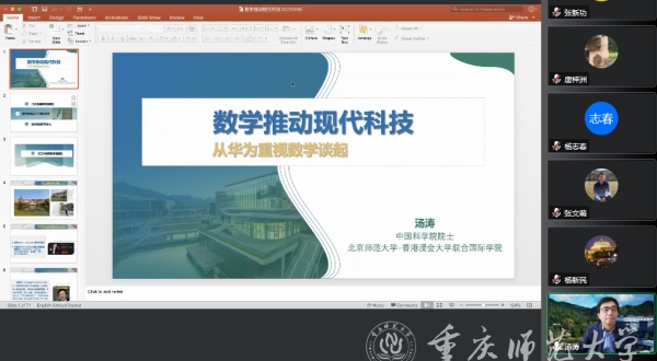 11月30日下午,中國(guó)科學(xué)院院士、北京師范大學(xué)-香港浸會(huì)大學(xué)聯(lián)合國(guó)際學(xué)院校長(zhǎng)湯濤院士受邀為我校師生作題為《數(shù)學(xué)推動(dòng)現(xiàn)代科技-從華為重視數(shù)學(xué)談起》的線上學(xué)術(shù)講座,講座由數(shù)學(xué)學(xué)科帶頭人、重慶國(guó)家應(yīng)用數(shù)學(xué)中心主任楊新民教授主持,數(shù)學(xué)科學(xué)學(xué)院和國(guó)家應(yīng)用數(shù)學(xué)中心部分師生、以及市內(nèi)外相關(guān)專(zhuān)家學(xué)者300余人參加。